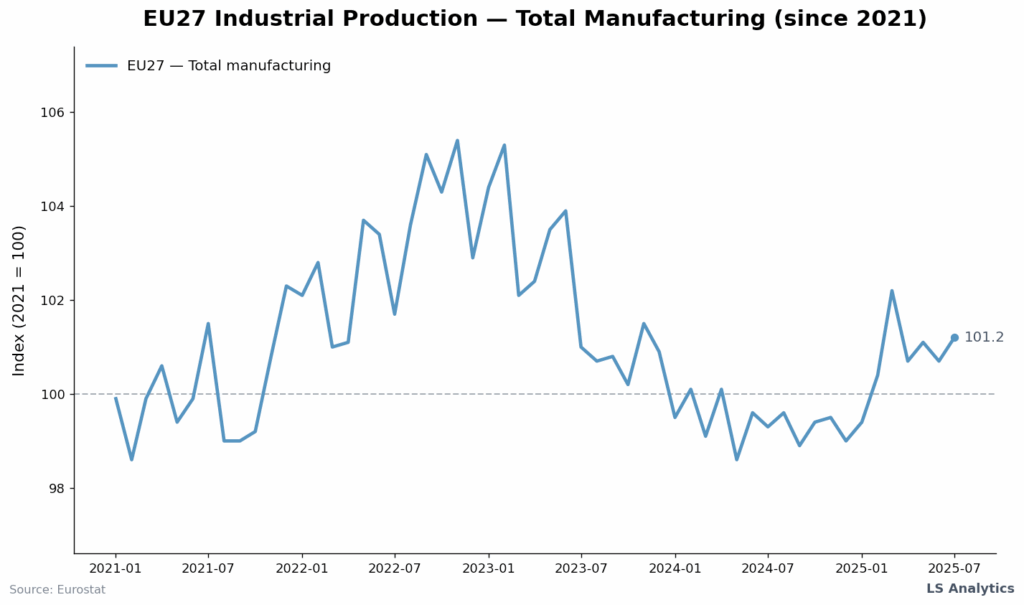 EU manufacturing experiences a relatively flat trend, with no significant upward trajectory after 2021. In July 2025, total manufacturing production is higher than during the pandemic, but only due to better performance in the first half of 2025.