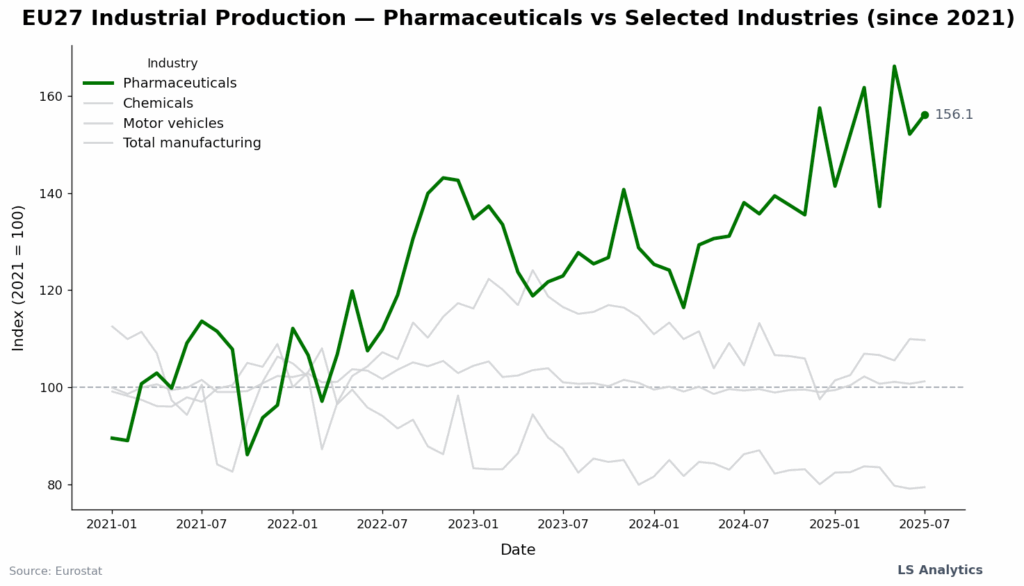 According to Eurostat, pharmaceutical production output surged by more than 13% year-on-year in July 2025. What makes this increase interesting is not only its scale but also the source. Upon closer examination of the data, it becomes clear that most of it is attributed to only one country: Ireland.