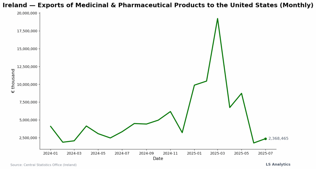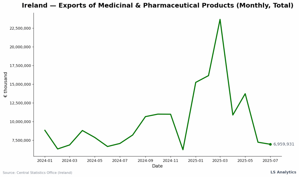 And let’s also see what’s happening later in 2025. The Irish exports of medicines have plummeted to one of the lowest levels in the last 2 years. This decrease directly corresponds to a decline in exports to the US, from 80% to 34%.